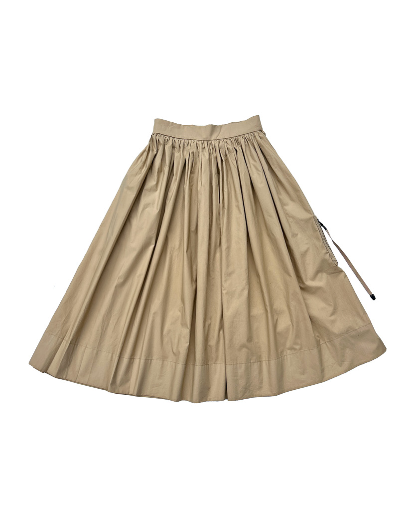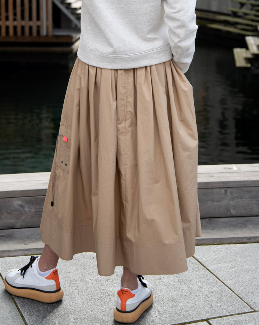 Skjørtet har en påsydd bomber lomme i venstre side. Inspirasjon til bomber lomme er hentet fra den klassiske bomber jakken, som altså har en slik påsydd lomme på venstre erme.