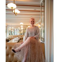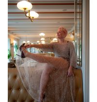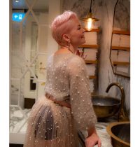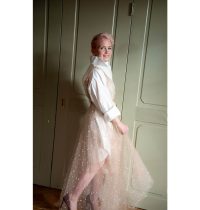 En slik kjole er veldig gøy å lage i tyll. Tyll er et stoff som ikke rakner og derfor trenger vi ikke å kante når vi syr. Her kan vi bare kutte stoffet der vi vil og ferdig med det. Du kan lage den i ensfarget eller tyll i mange forskjellige farger som du setter sammen selv. Bare lag deg en separat underkjole til, så blir garderoben din mer fleksibel. Du kan selvfølgelig også lage denne kjolen i ‘tett’ stoff. Da er det viktigste at stoffet er en del flowy, slik at stoffet faller litt pent.