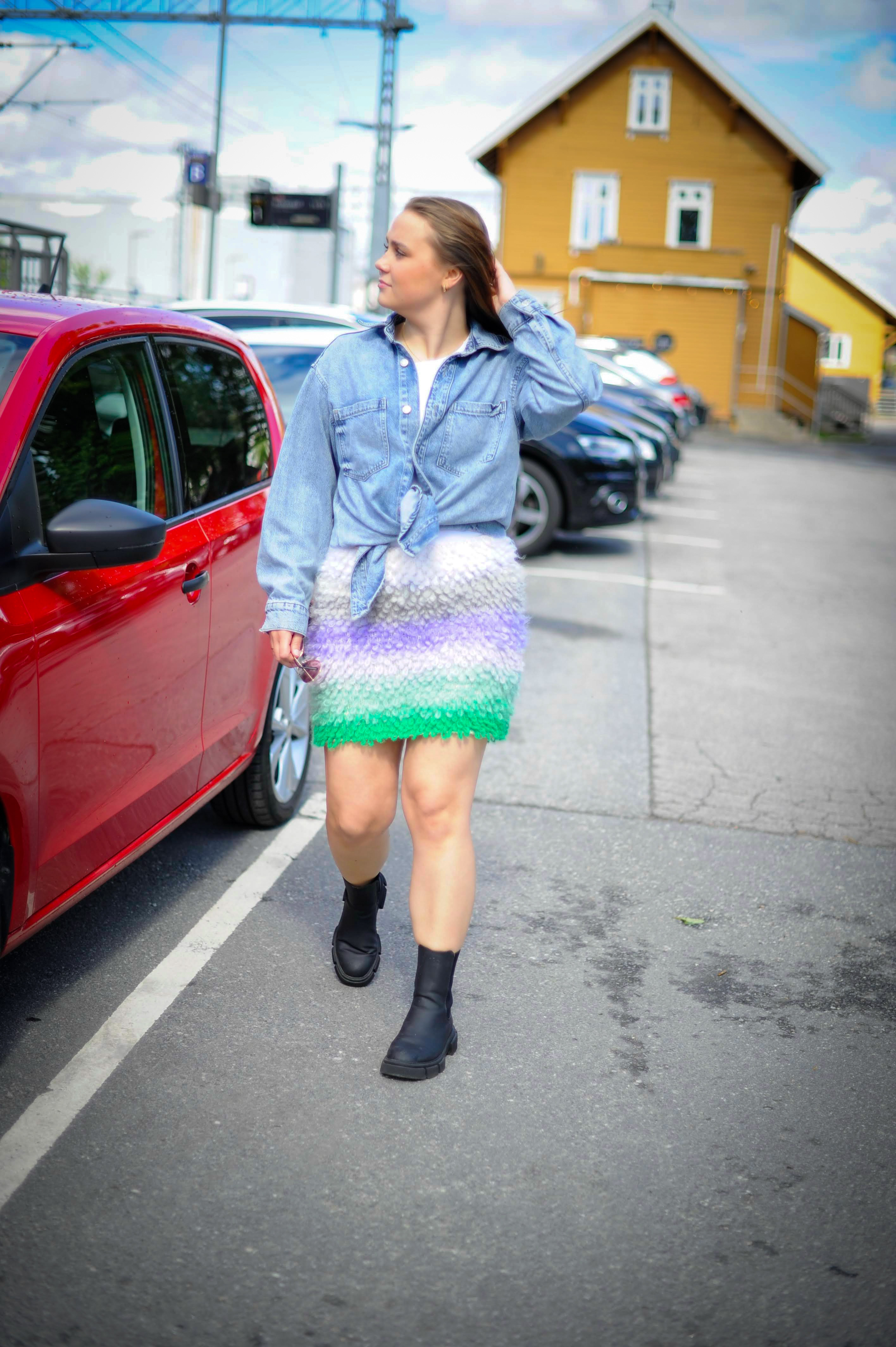 Skjørtet strikkes nedenfra og opp på p 4,5 eller 5.